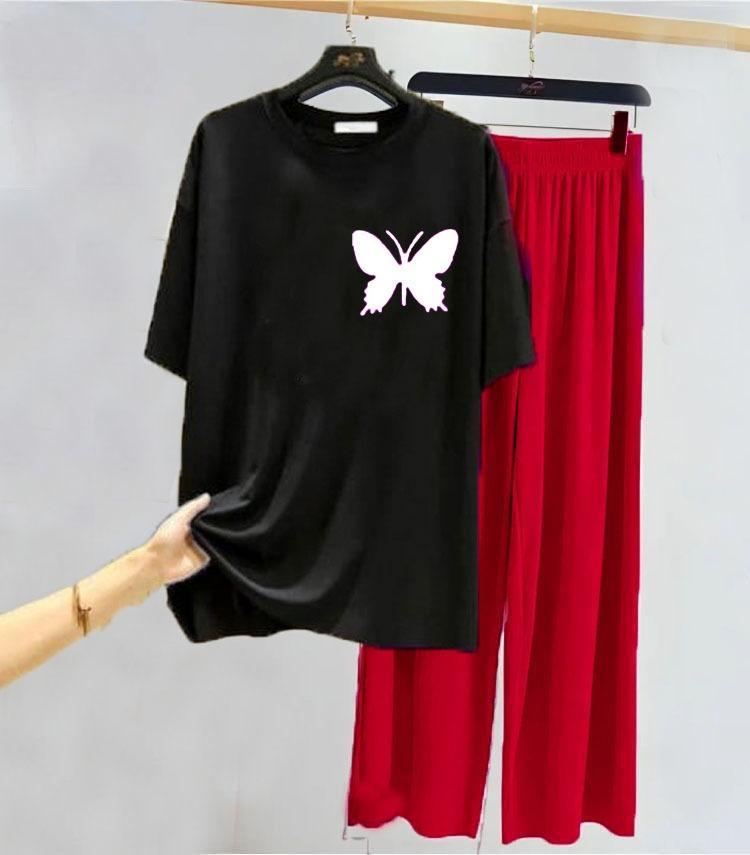 A comfortable and stylish night suit featuring a cute graphic on a black top paired with pink trousers, perfect for summer nights.