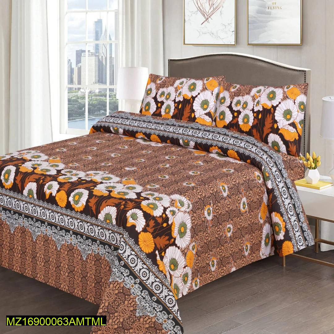 3 Pcs Cotton Printed Double Bedsheet