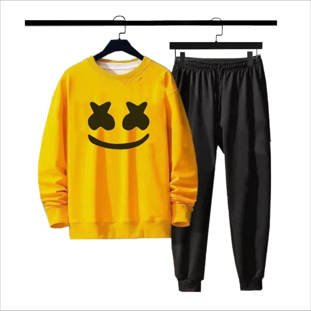 Elevate your casual style with this Men's Fleece Printed Sweatshirt Track Suit featuring a comfortable round neck design. Perfect for lounging or light workouts, this set includes 2 Pcs in vibrant yellow. Crafted from soft fleece, it ensures warmth and durability while making a fashion statement. Available in sizes Medium to X-Large for the perfect fit!