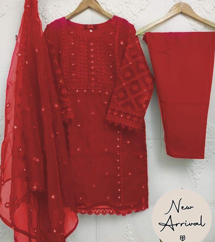 This exquisite women's stitched suit features a beautiful red organza fabric with intricate embroidered patterns. The set includes a stylish shirt, elegant trouser in malai crepe, and a matching embroidered dupatta, perfect for any festive occasion. Elevate your wardrobe with this charming 3-piece ensemble that promises elegance and comfort.