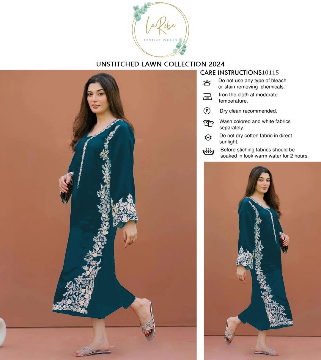 Step out in style with this exquisite blue suit set crafted from Dhanak fabric. The beautifully embroidered shirt features intricate detailing on the front, neckline, sleeves, and daman, while the back remains plain for a sophisticated look. Paired with matching trousers, this two-piece ensemble is perfect for any occasion.